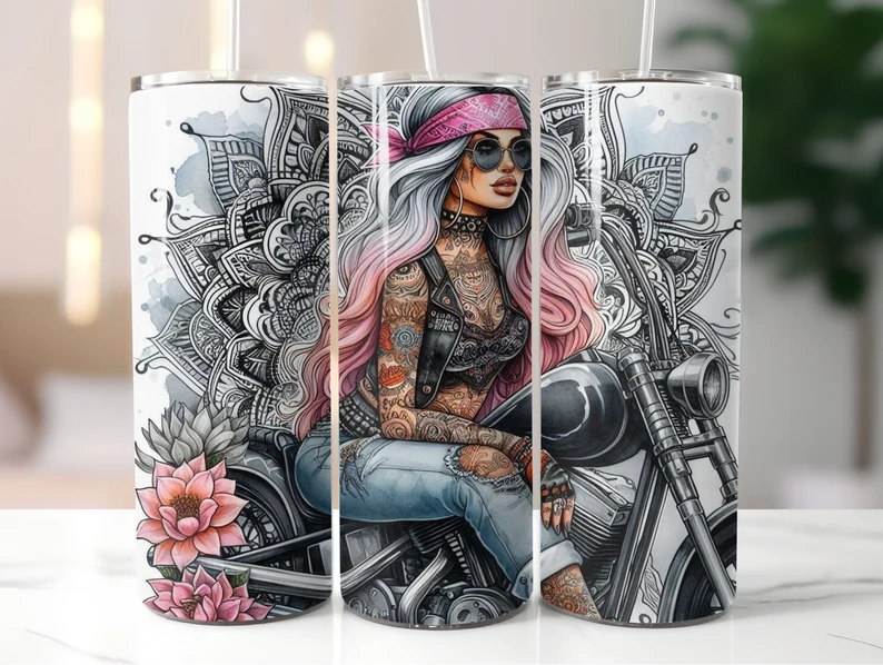 🏍 Female Rider Tumbler: This 20 oz tumbler showcases a stunning soft pink design featuring a Female Motorbike Rider and can be personalized with a name of your choice. (To include a name, simply add it in the checkout notes.)